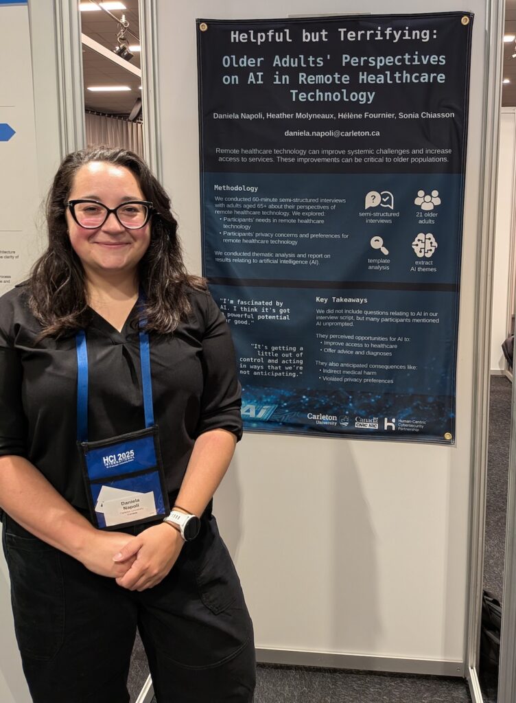 While at HCII, Daniela also presented her poster entitled: Helpful but Terrifying: Older Adults’ Perspectives of AI in Remote Healthcare Technology by D. Napoli, H. Molyneaux, H. Fournier, S. Chiasson. This work is done with our NRC collaborators and funded by the Human-Centric Cybersecurity Partnership (HC2P).